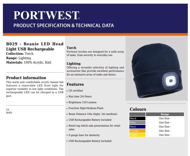 CE certified. Run time of 2/4 hours. Brightness 150 lumens. Function high-medium-flash. Beam distance 10m (high), 5m (medium). USB rechargeable battery included. Retail tag which aids presentation for retail sales. 9 gauge liner for dexterity. Reach certified. SEDEX certified