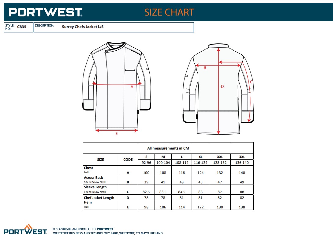 Portwest C835 Surrey Chefs Jacket L/S C835
