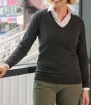 50% Merino Wool, 50% Cotton. V-neck jumper, ribbed neck, cuff and hem, double contrast inner neck design detail.